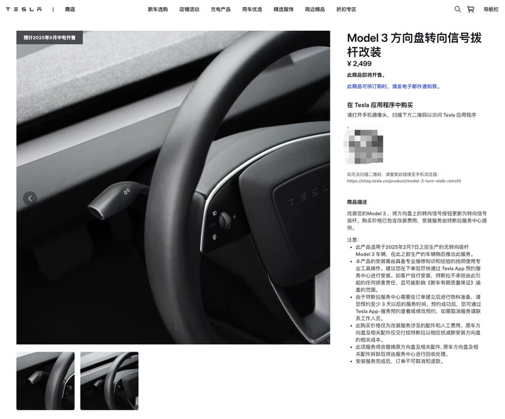 最近,特斯拉在其中国官网上线了专为焕新 Model 3 设计的「转向信号拨杆改装」服务,售价 2499 元。